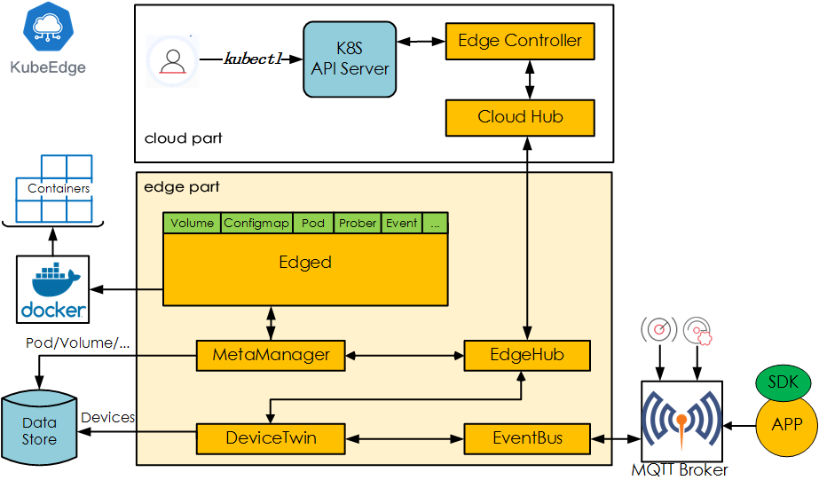 EdgeController: Manages the Edge nodes. It is an extended Kubernetes controller which manages edge nodes and pods metadata so that the data can be targeted to a specific edge node.